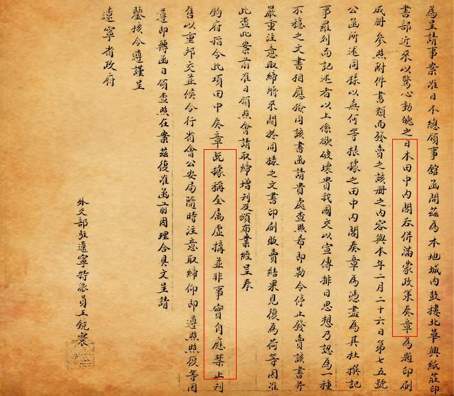 因该“奏折” 明言:“惟欲征服支那,必先征服满蒙。如欲征服世界,必先征服支那”,故当年披露之时,曾予国人极大刺激;日本政府亦竭力否认该“奏折”之存在。及至“九一八事变”爆发,日本对外扩张之步调,竟不出“奏折”所规划之范畴,该文件之真实性,遂获中外普遍认可。但自日本战败投降至今,始终未曾发现“奏折”原件。
