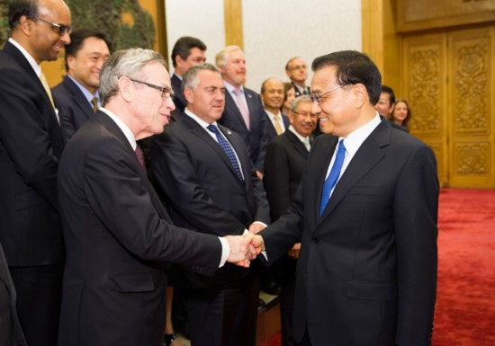 国务院总理李克强21日下午在人民大会堂集体会见来京参加第21届亚太经合组织(APEC)财长会的各经济体代表团团长。