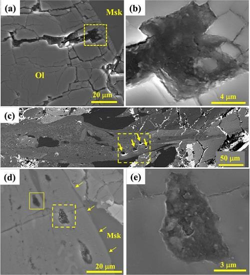 Tissint火星陨石中的有机碳颗粒,充填于微裂隙(a-b)或包裹在冲击熔脉中(c-e)(下图)
