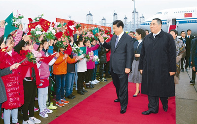 彩旗飞舞,鲜花含笑,澳门处处洋溢着欢乐祥和的气氛。中午12时15分,习近平乘坐的专机徐徐降落在澳门国际机场。习近平和夫人彭丽媛走下舷梯,澳门警察乐队奏起热情喜庆的欢迎曲,两名澳门少年儿童上前分别向习近平和彭丽媛敬献鲜花。习近平和彭丽媛在澳门特区行政长官崔世安和夫人霍慧芬陪同下,同前来迎接的人员亲切握手。数百名澳门少年儿童和各界群众代表挥动手中的国旗和区旗,热烈欢迎习近平的到来。习近平面带笑容,向欢迎人群频频挥手致意。