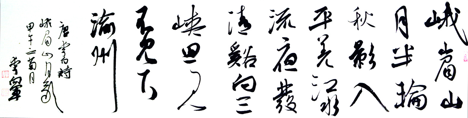 李向军书法作品说明:峨眉山月半轮秋,影入平羌江水流。夜发清溪向三峡,思君不见下渝州。