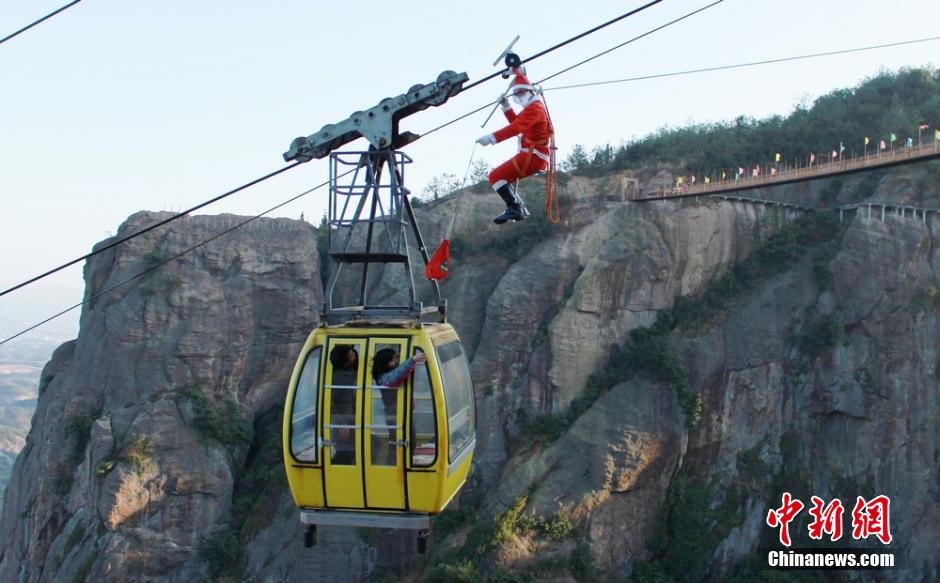 一年一度的圣诞节又即将到来,人们总是会以你想不到的方式欢庆节日。就在12月21日,湖南平江石牛寨景区的一位工作人员装扮成“圣诞老人”,爬上高空索道为游客派送圣诞礼物,以此迎接即将到来的圣诞节。 杨华峰 摄