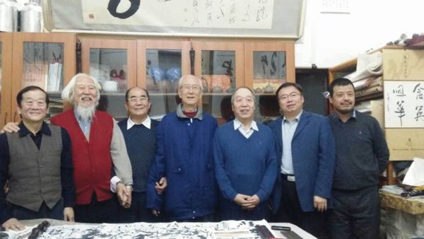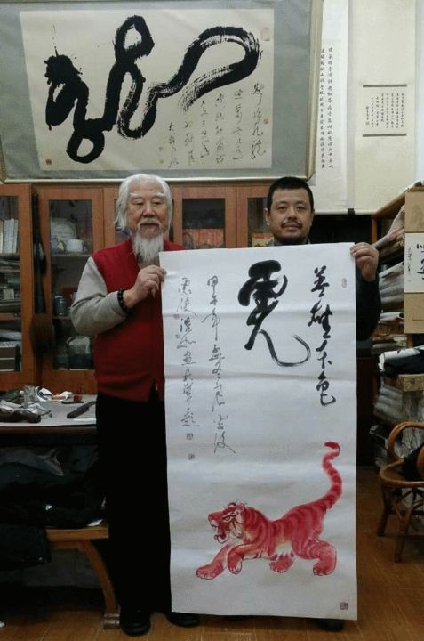 这些人中,一位鹤发童颜、银髯飘飘的老者非常引人注目,他面带笑容,时时击节点头。他就是在中国有“虎侠”之称的著名画家刘相训先生。在其背后,悬挂着草堂主人、以“一笔龙”誉满华夏的书法大漠与相训先生合作的一张五虎图,画面上刘先生以淡墨绘就的五只老虎栩栩如生,仿佛带着一阵英风、一团生气扑面而来,大漠题写的画名“五福吉祥”,飘逸洒脱,相得益彰。