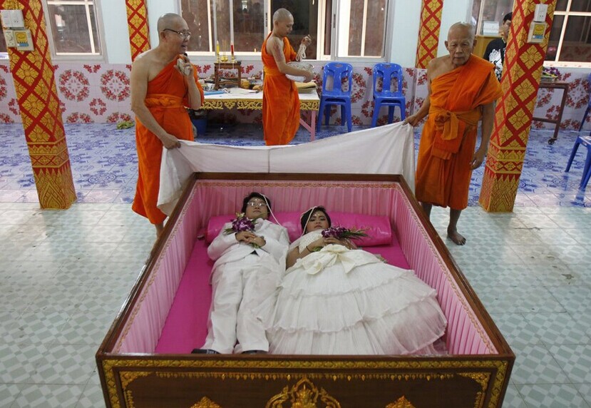 只是不同一般的礼堂,酒店婚礼,这对新人躺在棺材中结婚,接受僧人的祈福,泰国人相信躺在棺材中可以去除坏运气。