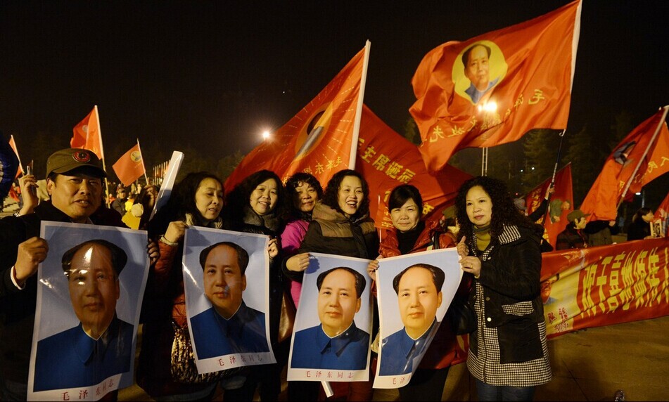 12月25日,群众在毛泽东广场唱红歌,齐诵毛泽东诗词。甚至有些群众举着旗帜,拿着标语和毛泽东画像的民众在广场活动。