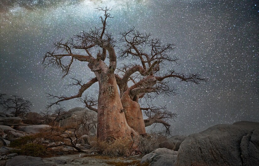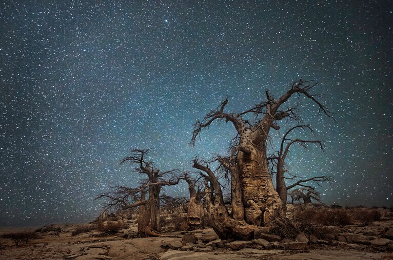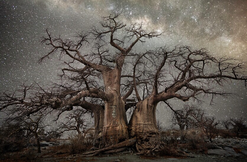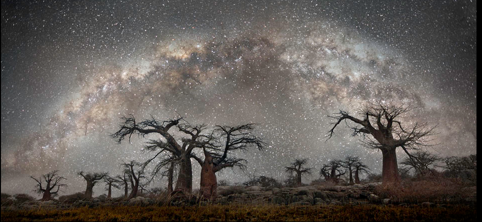 这些照片都拍摄于人烟罕至的地方,远离大城市的光污染和空气污染,例如非洲博茨瓦纳,纳米比亚,南半球的角落。你可以看到巨大的猴面包树和超现实风格的箭袋树,这些奇观一样的植物就这样矗立在同样奇观的银河系星辰之中。