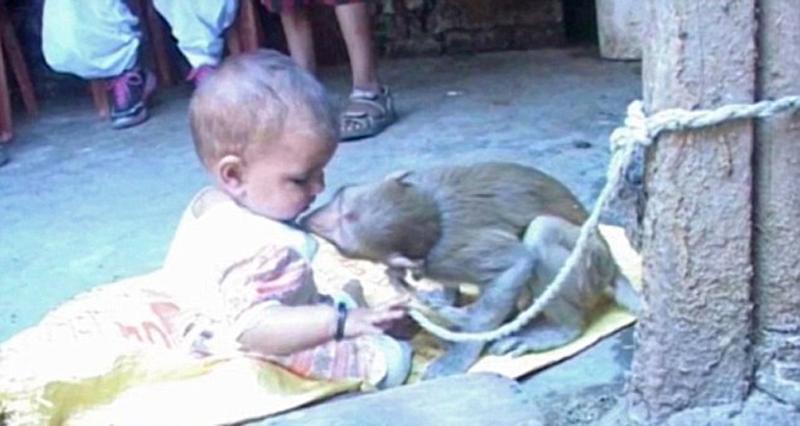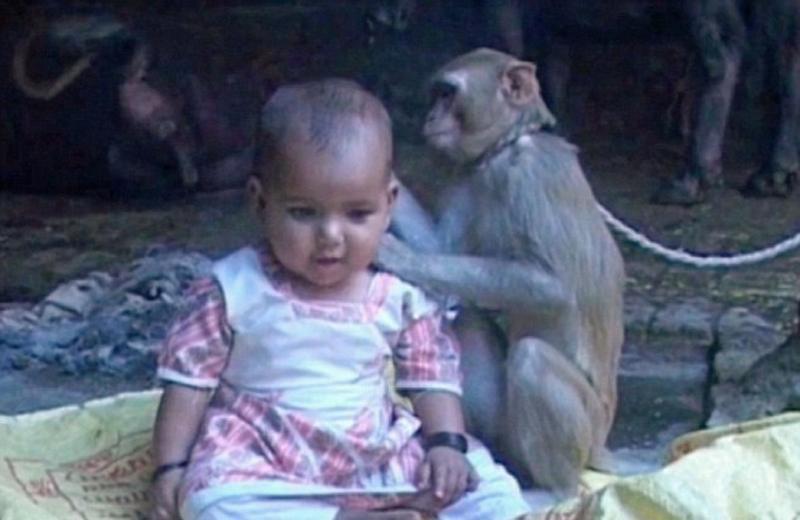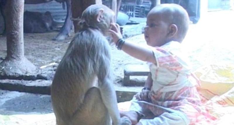 印度北部哈雅纳邦亚穆纳讷格尔市的一名小女孩和一只猴子建立了如母女般的深厚情谊,她们拥抱、亲吻,并且一起玩耍。
