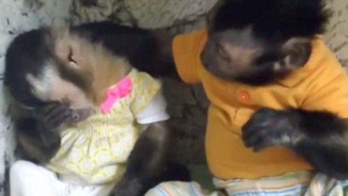 近日,在美国一处野生动物基地内上演了温情的一幕:为安慰自己伤心的同伴、一只名为安吉丽卡的雌性小猴,雄性小猴托比绅士十足的将其揽在臂弯,并双目含情凝望着自己的好伙伴。