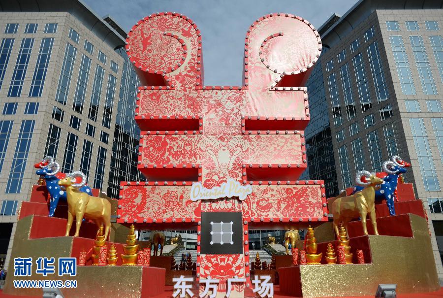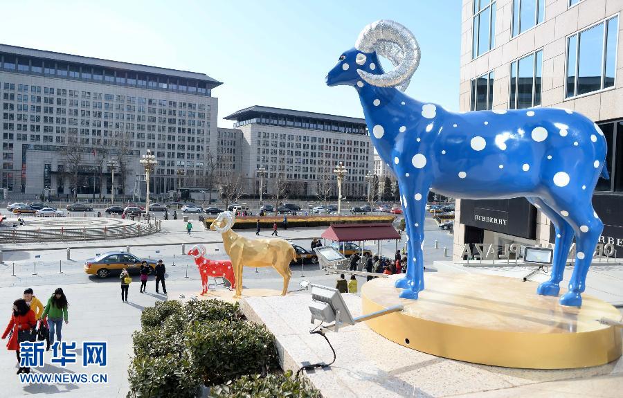 羊年春节临近,一座大型羊造型景观近日亮相北京东方广场,在东方君悦大酒店台阶两侧,也设置了8只彩色雕塑羊,营造了浓浓的节日气氛。