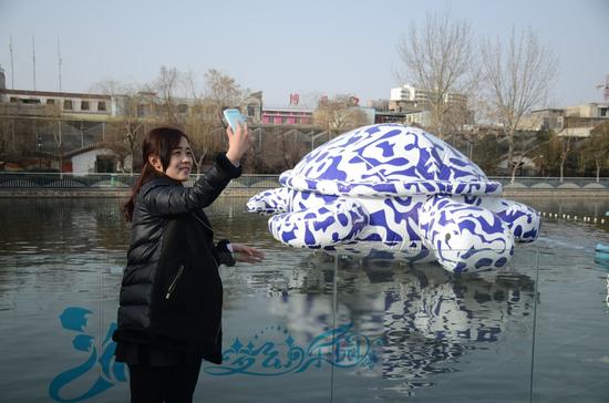 这个“海龟”不是我们见到的会在水里游的海龟,而是一个长约12.8米,高约4.5米的充气式海龟。它蓝白相间的颜色,代表着海水与浪花交相辉映,也向大家展示了一种海洋之美。