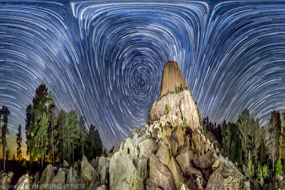 摄影师Vincent Bradys走遍了全美,拍摄了一组主打漩涡状的星迹和强烈色彩对比的“星空全景图”。他的拍摄技法十分酷炫,通过将四台装配有鱼眼镜头的相机固定在一个十字架上,再运用长曝光来捕捉夜空中恒星视运动的星迹。