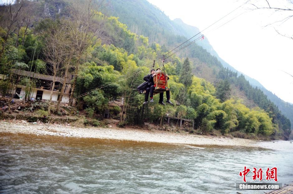 3月9日,重庆市奉节县法院第三人民法庭的法官在九盘河上乘坐溜索下乡办案,辗转70余公里山路前往海拔1200余米的兴隆镇桃源村调解民事纠纷。