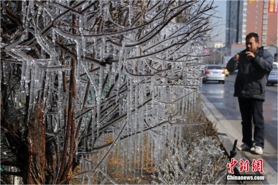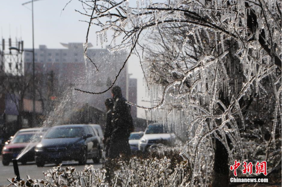 近日,山西太原,由于气温偏低,街头绿化带内的树木和栏杆在喷灌后,结出了晶莹剔透的冰挂,成为一处别样景观。