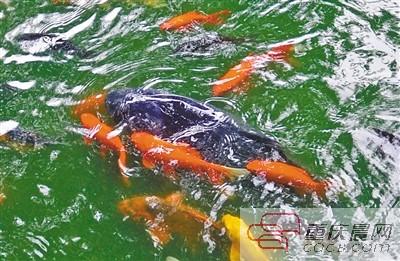 昨日,大渡口公园观赏鱼池内,在一群锦鲤的簇拥下,“莽子”(黑色)的个头显得格外突出。