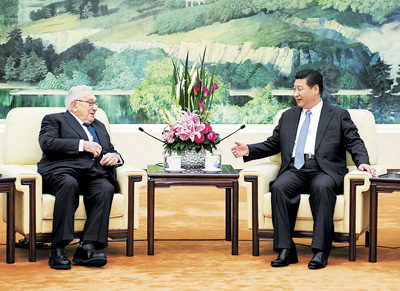 习近平称赞基辛格是中美关系的开拓者和见证者,赞赏他数十年来为推动中美关系发展作出的重要贡献。习近平指出,中美关系正取得重要和积极进展。去年11月,我与奥巴马总统在北京成功会晤,不久前我们再次通话,就中美关系发展作出了规划。构建中美新型大国关系不仅符合两国人民根本利益,也有利于亚太地区乃至世界和平、稳定和繁荣。中方高度重视中美关系,愿与美方一道努力,精心呵护两国关系,落实好双方达成的共识,加强高层及各层级交往,深化各领域务实合作,推动两国关系不断发展。我期待着年内对美国进行国事访问。
