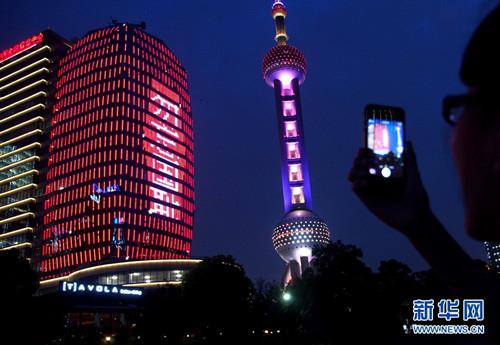 8月12日,黄浦江畔的中国金融信息中心玻璃幕墙上闪现“勿忘国耻”字样。