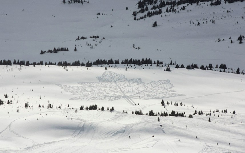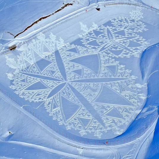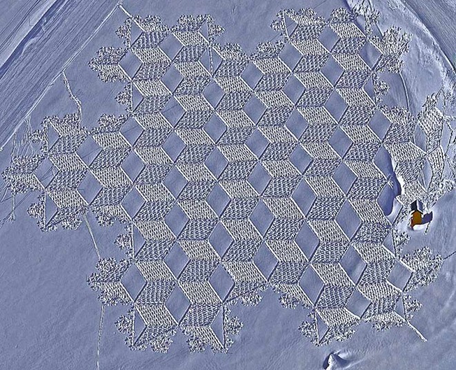 你还在雪地上写名字?看看别人家的艺术家。英国艺术家Simon Beck把雪地踩出了新高度。
