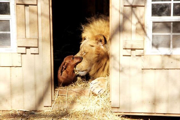 【环球网综合报道】据英国《每日邮报》8月14日报道,美国俄克拉荷马州的G.W.珍奇动物公园有一对最不可能的朋友,一头轻微残疾的成年雄狮和一只8岁的达克斯猎狗从小就成为了伙伴,它们在过去的5年里几乎形影不离。