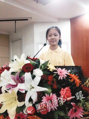 陈颖洁是重庆育才中学高一(1)班的学生,也是2014年中国西部数学邀请赛育才中学代表队9位选手中唯一的女生。作为发言代表,陈颖洁一上台,先用现代汉语介绍了自己,然后就开始了文言文发言,“山峦嵚崟,雾霭茫茫;两江汇聚,流水汤汤……”