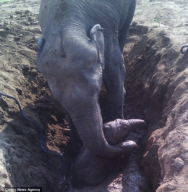 11个小时后,村民闻讯赶来,帮助这位意志坚决的象妈妈把小象救了出来。