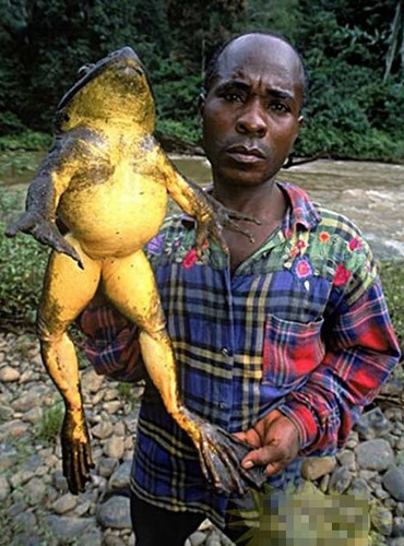 这种俗称为goliath的巨型青蛙成年后体重3公斤,身长(从头到腿)可达1米,抱在怀里就像抱个婴儿。然而,这种青蛙数量稀少,已经濒临灭绝。