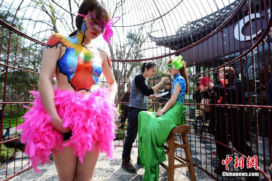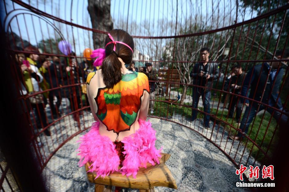 近日,一场以“孔雀”为主要元素的人体艺术“时装”秀在扬州一巨型鸟笼里进行,艺术家用画笔将图案绘在模特胳膊、脸、腿等身体部位,勾勒人体彩绘时装,吸引众多游客和市民驻足观看。