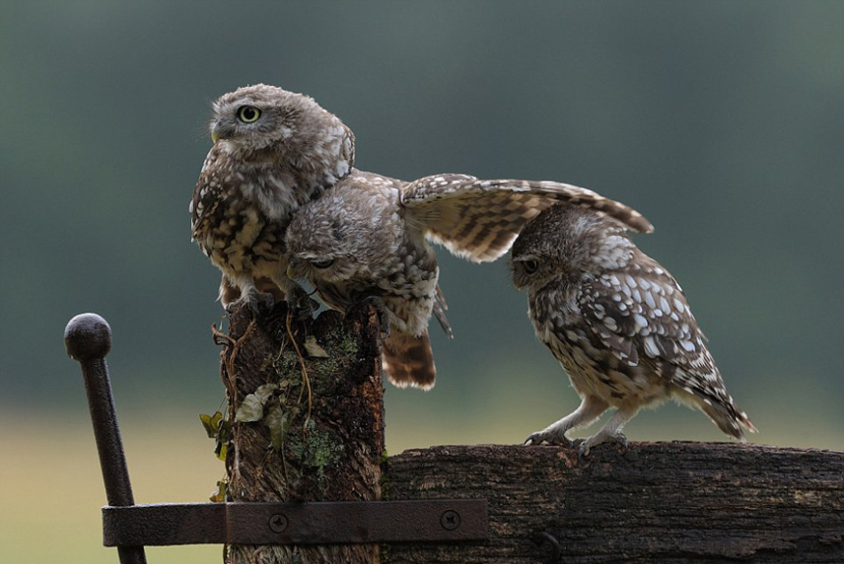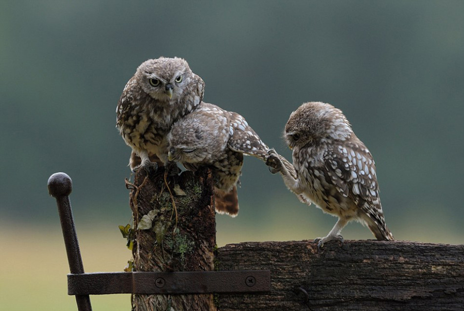 当时,两只小猫头鹰紧紧贴在一起站在一处枯树桩上。旁边的小猫头鹰看上去非常怜人,好像十分羡慕他们兄弟间的亲密接触。只见它亦步亦趋来到他的两兄弟面前,伸出爪子,挠挠兄弟的翅膀,一副“求抱抱”的姿态。它的兄弟一开始将头扭了过去,对它有点儿嫌弃。小猫头鹰凑近两兄弟。最后,这只小猫头鹰终于成功钻到了兄弟的翅膀底下,三只小猫头鹰抱成一团,看上去一派温馨景象。