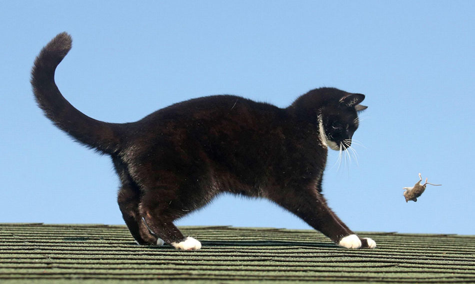 猫咪的主人将它起名为“莫斯”(Mouse),跟英文里的“老鼠”(mouse)写法相同。与《猫和老鼠》里经常被小老鼠欺负的猫咪不同,只见莫斯在屋顶上像扔皮球一样,用爪子将可怜的小老鼠抛来抛去,完全占据了上风。最后莫斯也毫不留情,美美地享用了到手的美食。