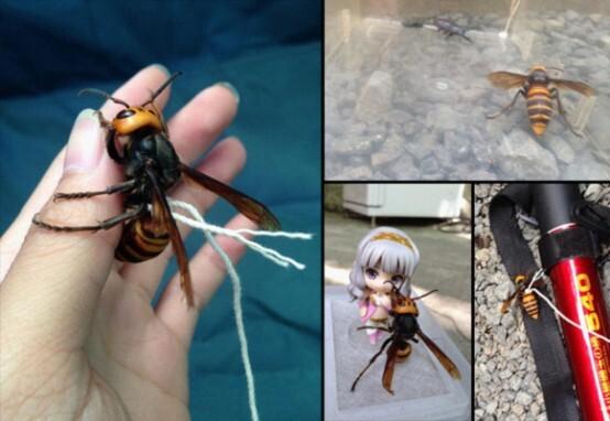 据香港《文汇报》8月14日报道,日本大黄蜂以毒性高出名,极其危险,但东京一名男子却声称“驯服”了一只大黄蜂,还用绳子绑住蜂腰,当宠物般随身携带,并将照片上载到twitter分享,不过有网民认为大黄蜂其实早已死掉。