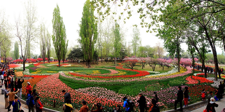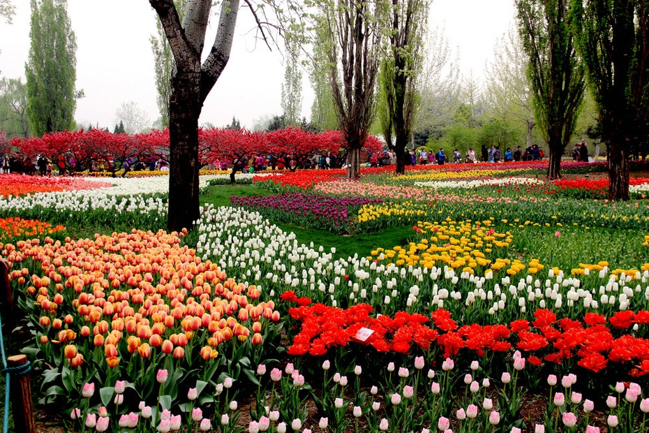 今年北京倒春寒,倒使各种花期延长,从云贵回京,看到连翘,碧桃还在盛开,丁香,海棠也已怒放。听说植物园郁金香已开。南园里繁花似锦,门前水池边碧桃正盛,倒影旖旎。路边树上各种小花繁茂盛开,可惜很多都叫不上名目;北园,一路上顾不上欣赏,花坛里各色小花花团锦簇,路边满树碧桃耀眼,丁香飘香。有些品种的花还没有盛开,色彩稍差。但郁金香那独特的明丽色调和浩大声势还是给人巨大的视觉冲击。