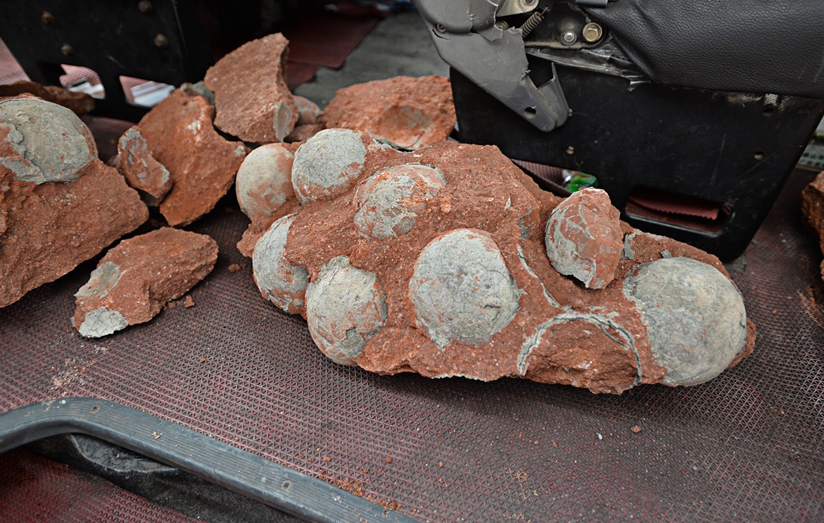 这窝恐龙蛋化石地处红砂岩层,由于施工被分成了14块,共43枚,其中完整的19枚,都是直径约13厘米的“大个子”。
