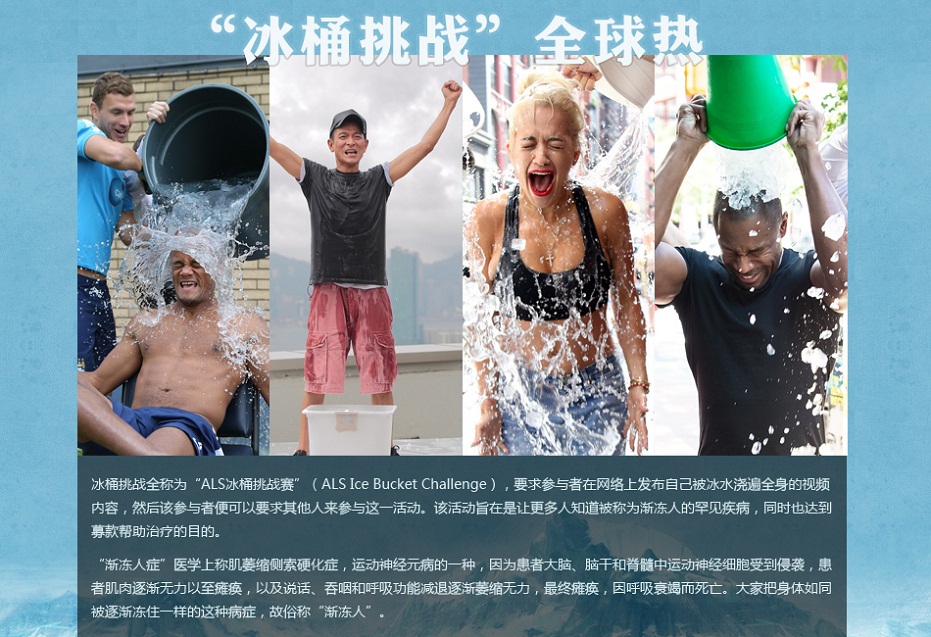 近日,由美国波士顿学院前棒球选手发起的ALS冰桶挑战(IceBucket Challenge)风靡全球,各界大佬纷纷湿身挑战。据了解,挑战者接到战帖后,可选择拿起装满冰块的冷水朝自己泼下去,或捐100美元,或两者都做,再指名3位挑战者接棒。