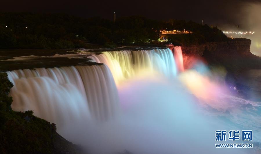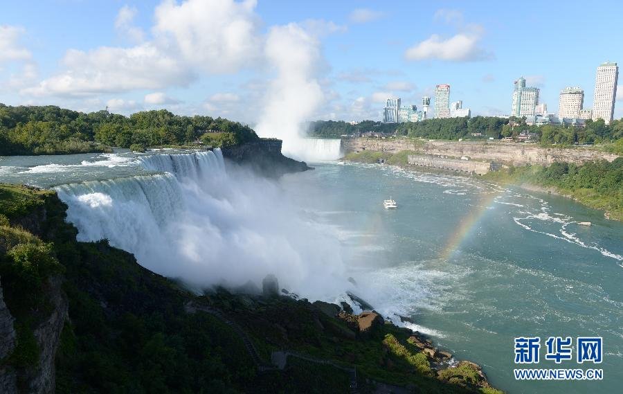 8月17日,在美国与加拿大边界,尼亚加拉大瀑布上出现彩虹。尼亚加拉大瀑布位于美国与加拿大交界的尼亚加拉河上,是著名的跨国瀑布,年均流量每秒5,720立方米,其中规模最大的马蹄瀑布落差50多米,宽约670米。