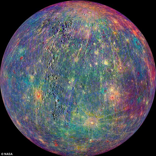 最近,美国宇航局发布了几张由信使号飞船搭载的“可见光与红外光谱仪”(VIRS)拍摄的图像,显示水星地表上一些可能是火山管道或是新鲜撞击坑的景物。为了凸显地质特征,这些图像与来自信使号探测器上的“水星双成像系统”(MDIS)拍摄的黑白图像进行了叠加。