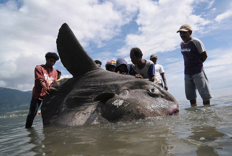 近日,几名印度尼西亚的渔民发现了一条巨型翻车鱼,它有1.5吨重,长超过2米。这只罕见的翻车鱼被发现时已经被海浪冲上了印度尼西亚苏拉威西的海岸。当地人试图把它送回海中,但是潮水不停地把它推上岸,最终这只鱼死了。