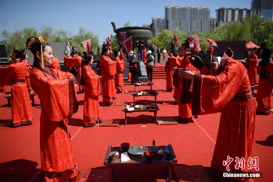 5月4日,国际青年节。山西太原,42对青年新人着汉服、执古礼,在赞礼官的带领下,宣告彼此对爱情的承诺,展现出传统民族文化的魅力。