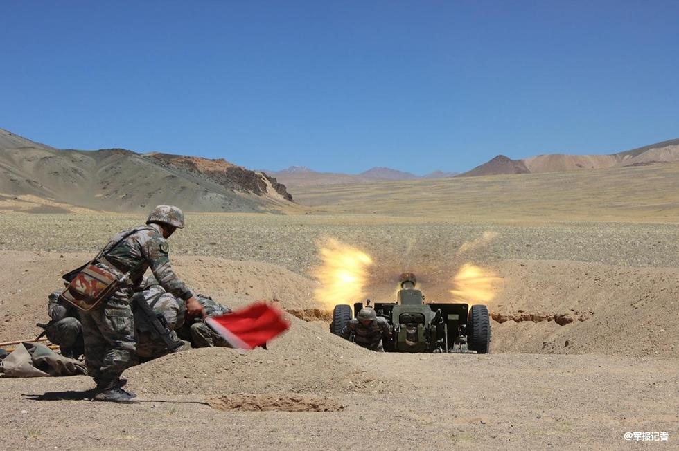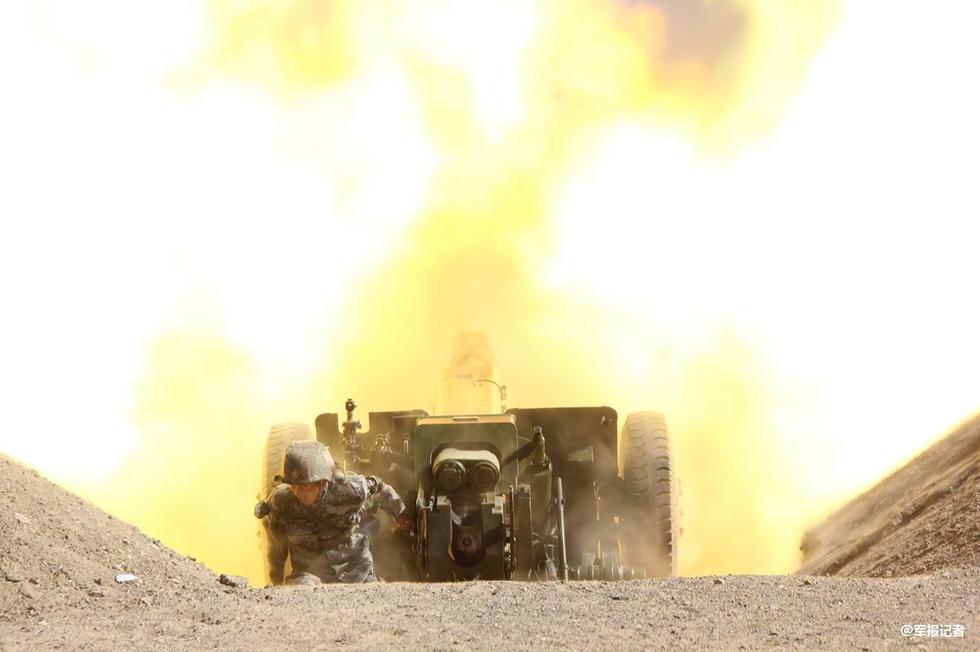 解放军海拔4500米进行榴弹炮实弹射击演练。