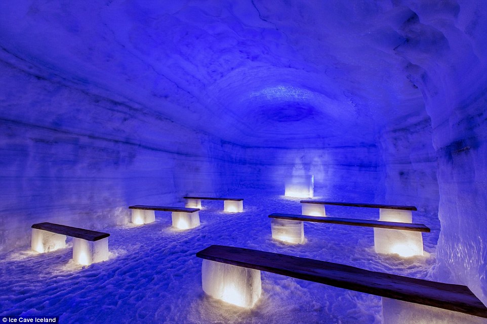 近日被称为旅游的热点,游客可以走半英里的路线,观赏冰壁从白色到深蓝的变化。冰壁颜色从白色到深蓝在该冰洞中甚至设置有冰雪教堂,人们可以在其中举办婚礼。