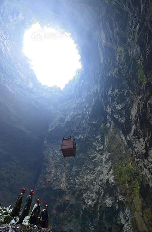 这个巨大的“天坑”曾是一处垃圾倾倒点,当地一家企业投资数百万元对此处的垃圾进行清运,逐步恢复天坑内的生态系统,拟将此打造成一个集探险、休闲、地质观光为一体的景区。图为工人通过吊篮向“天坑”外运送垃圾。