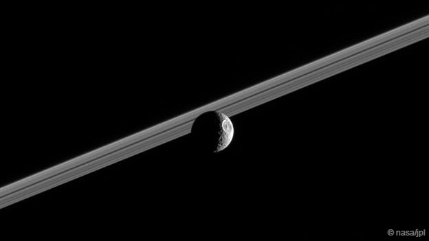 米玛斯,即土卫一。它的直径不到400公里,表面遍布陨石坑,是土星最小也最靠里的卫星