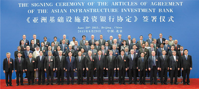 6月29日,国家主席习近平在北京人民大会堂会见出席《亚洲基础设施投资银行协定》签署仪式的各国代表团团长。