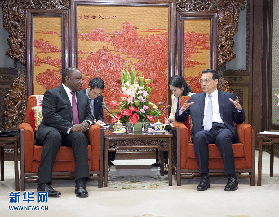 李克强表示,中南同为发展中大国,双方关系建立在相互尊重、平等相待、互学互鉴基础之上。前不久两国元首在出席金砖国家峰会期间又一次会晤。中方愿同南非巩固政治互信,深化互利合作,密切在国际和地区事务中的沟通协作,与非洲各国一道打造南南合作的典范,共同维护世界和平,促进地区发展。
