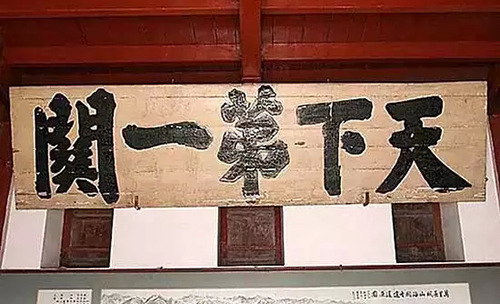 此匾乃明代著名书法家萧显所书。其匾长5米多、高1.5米,每个字都是1米有余,其大自不待言;它从东向西逐渐增大,在笔划的处理上,把第一的“第”字改写成草字头的“苐”,使笔划减少,视觉上的分量减轻,让繁体的“关”字笔划凝重、粗壮有力,牢牢地压住似乎将要翘起的城楼西端。