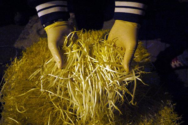 3.要把豆芽掐开看水分,健康的豆芽水分比较大。