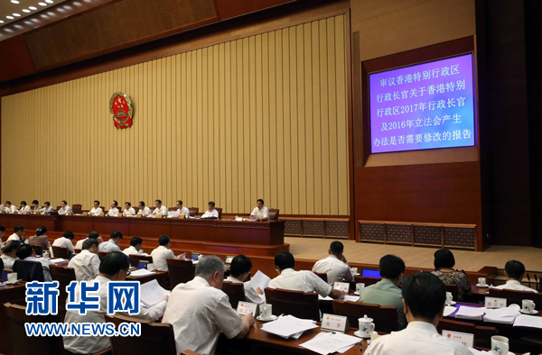 根据香港基本法有关规定及全国人大常委会关于香港基本法附件一和附件二有关规定的解释,香港特别行政区行政长官的产生办法以及立法会的产生办法是否需要修改,香港特别行政区行政长官应向全国人大常委会提出报告,由全国人大常委会依法确定。会议审议了香港特别行政区行政长官梁振英提出的关于香港特别行政区2017年行政长官及2016年立法会产生办法是否需要修改的报告。