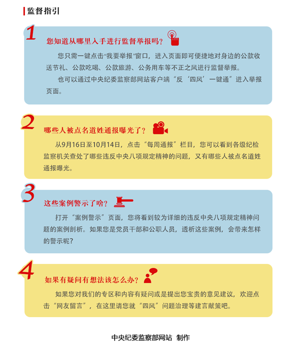 中秋国庆临近,为继续紧盯重要时间节点,驰而不息纠正“四风”,严防反弹回潮,释放越往后执纪越严的强烈信号,加大社会监督力度,畅通举报渠道,净化节日风气,中央纪委监察部网站6日推出《中秋国庆纠正“四风”监督举报曝光专区》。