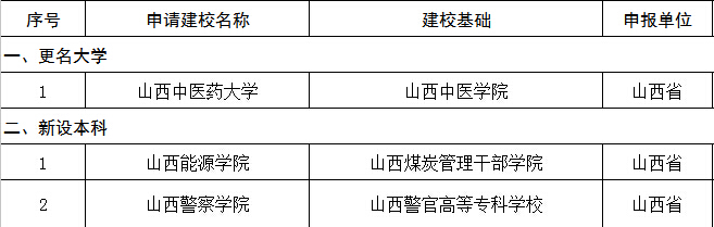 据教育部网站消息,教育部发展规划司日前印发《关于2015年列入教育部专家考察的申报设置高等学校的公示》,《公示》显示,2015年列入专家考察的申报设置中东部地区本科学校36所,18所学院更名为大学,新设本科高校17所,合并调整高校1所。其中,山西省有1所学院更名为大学,2所学院新设本科。
