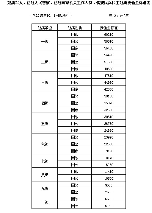 调整后,一级因战、因公、因病残疾军人抚恤金标准为每人每年60210元、58310元、56400元,分别比2014年提高了7850元、7610元、7360元。