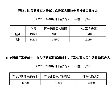 居住在城镇的烈属定期抚恤金标准提高到每人每年19120元;居住在农村的烈属提高到每人每年14510元。在乡退伍红军老战士及在乡西路军红军老战士和红军失散人员生活补助标准,分别提高到每人每年41750元、41750元和18840元。