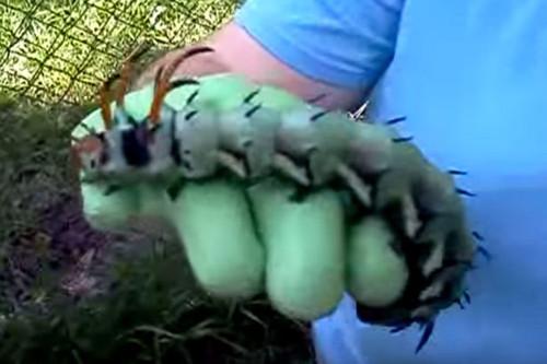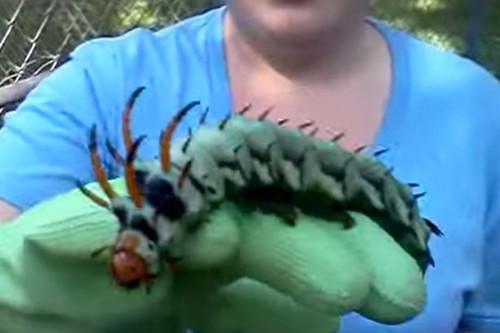这只毛毛虫的头上还长角,看起来就像是卡通画里的模样,外表吓人。